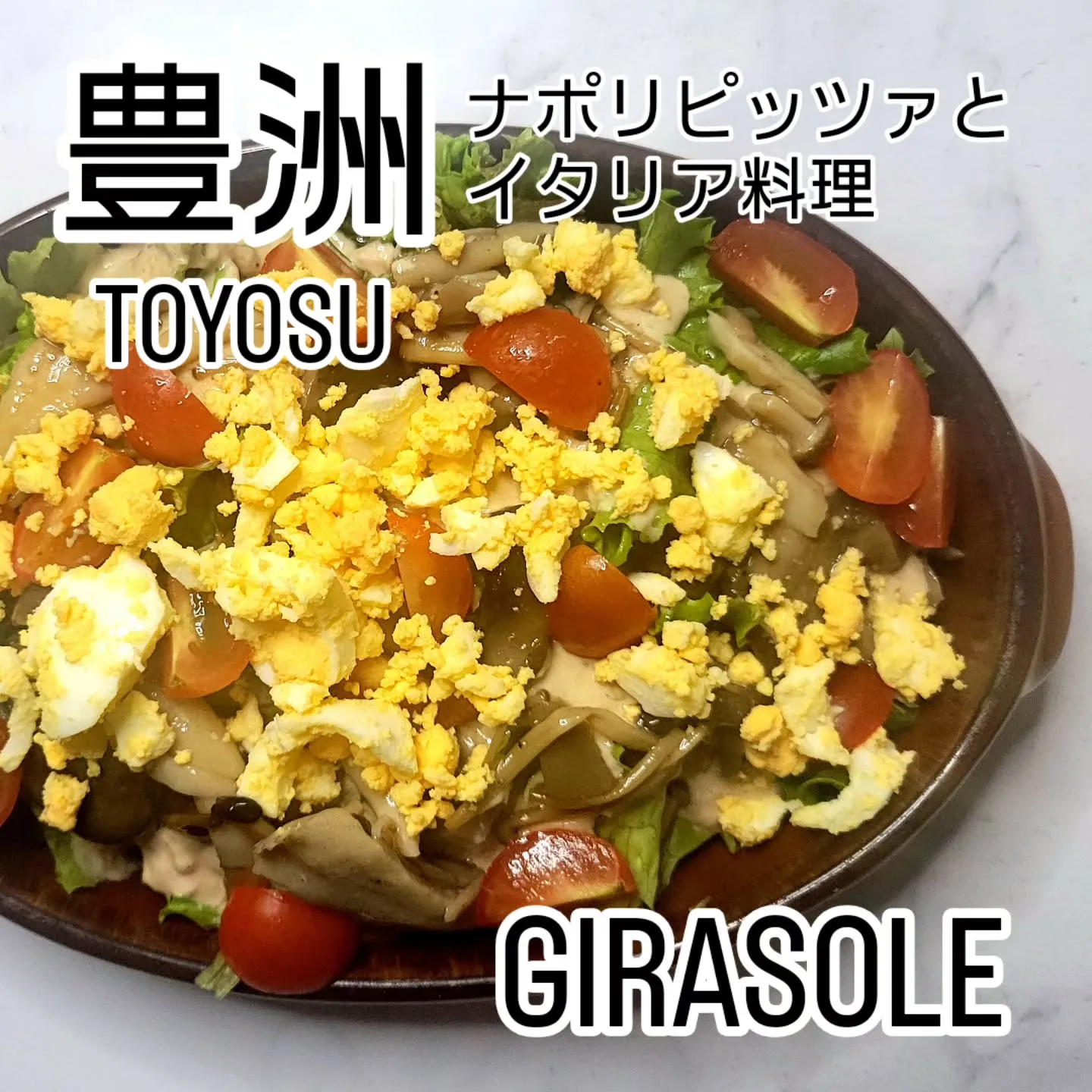リーフレタスにマリネした7種のキノコ、甘味たっぷりの熊本県産チェリートマトにゆで卵。食物繊維、たんぱく質とバランスの良いGIRASOLEに数少ない健康的な1品です