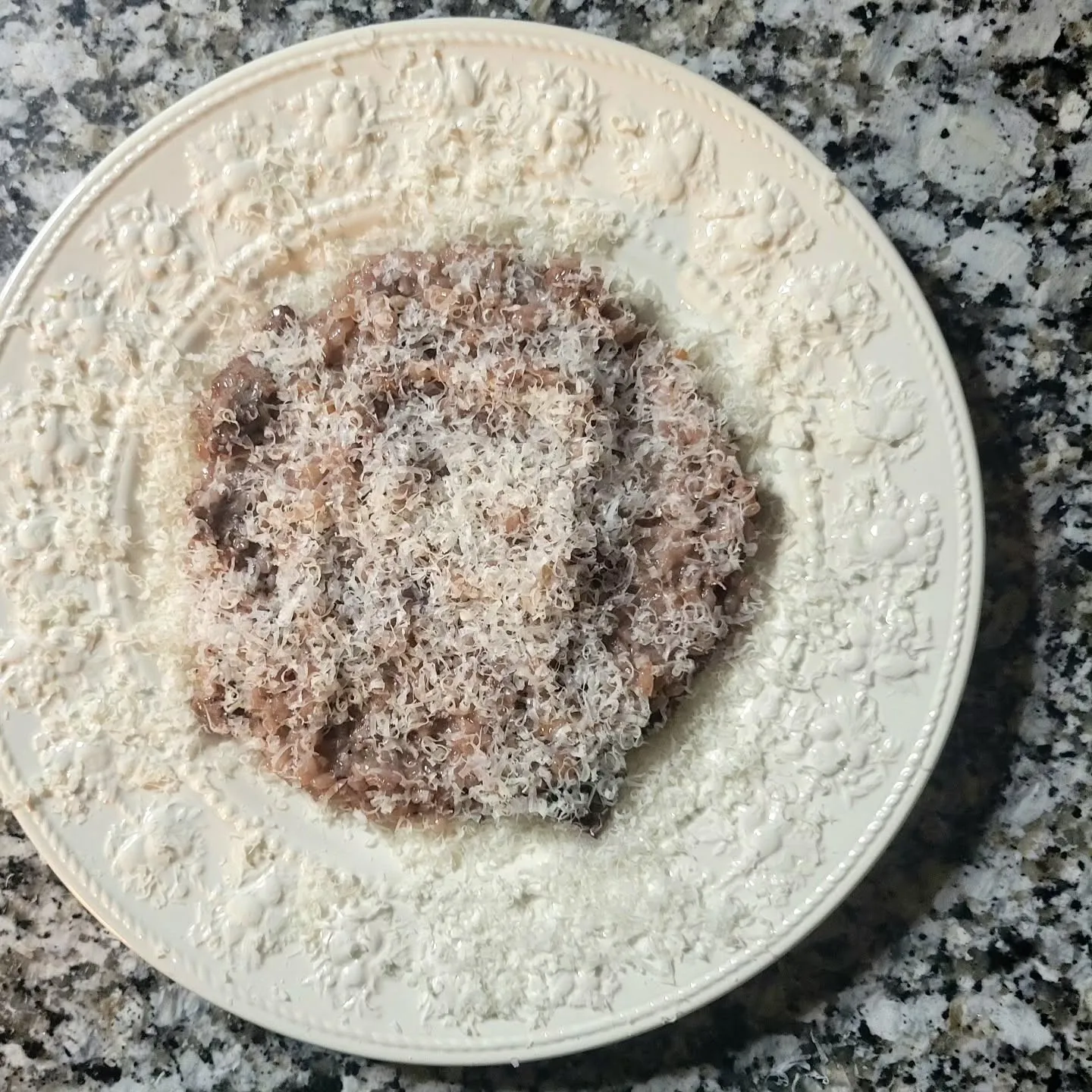 赤ワインとサルシッチャのリゾット 赤ワインとサルシッチャのリゾットRisottoalvinorossoパルミジャーノ削ったら見えなくなっちゃった。赤ワインはネロダーヴォラリゼルヴァ2020ハーブたっぷりの自家製サルシッチャ、栗、キノコの季節感無…